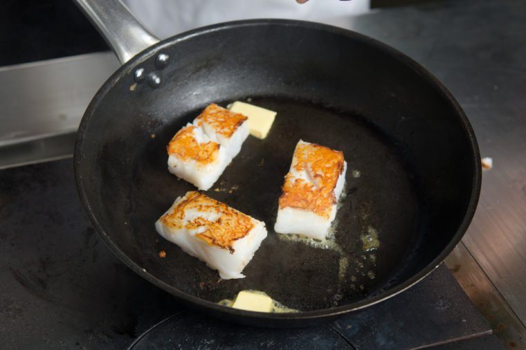 One word: heat. You can’t produce a perfectly seared piece of fish without a piping hot pan. “If you are looking for a sear, you need to bring on high levels of heat,” says Willcox. Willcox also warns against overcrowding the pan while searing; that could seriously diminish the heat and prevent your fish from developing that succulent brown crust. Keeping the pan nice and hot also prevents bits of the fish from sticking to the pan when you flip it over; when cold, the proteins in the fish are more likely to adhere to the metal.