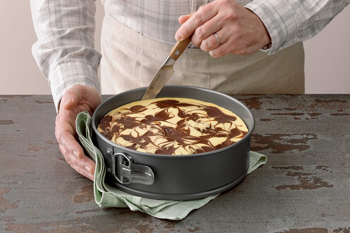Many cheesecakes, like this tasty brown sugar and chocolate cake and this blueberry swirl cheesecake, rely on swirling the batter with chocolate or jam to create a pretty design. While some of these finishes can look pretty fancy, they’re so simple to accomplish.