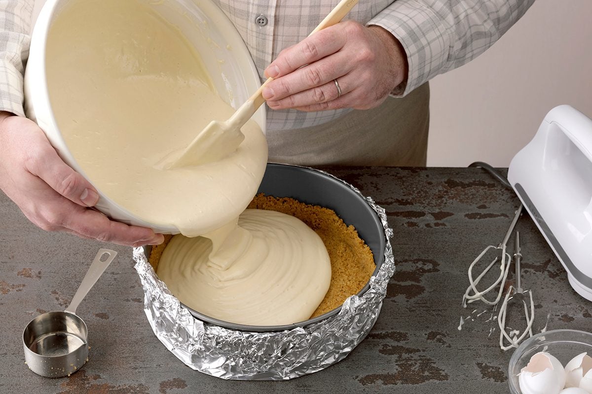 To do this, wrap the bottom of your springform pan with aluminum foil—even if the pan says leakproof. This is an extra precaution, but one that will give you peace of mind. Then give the inside of the pan a quick spritz of cooking spray.