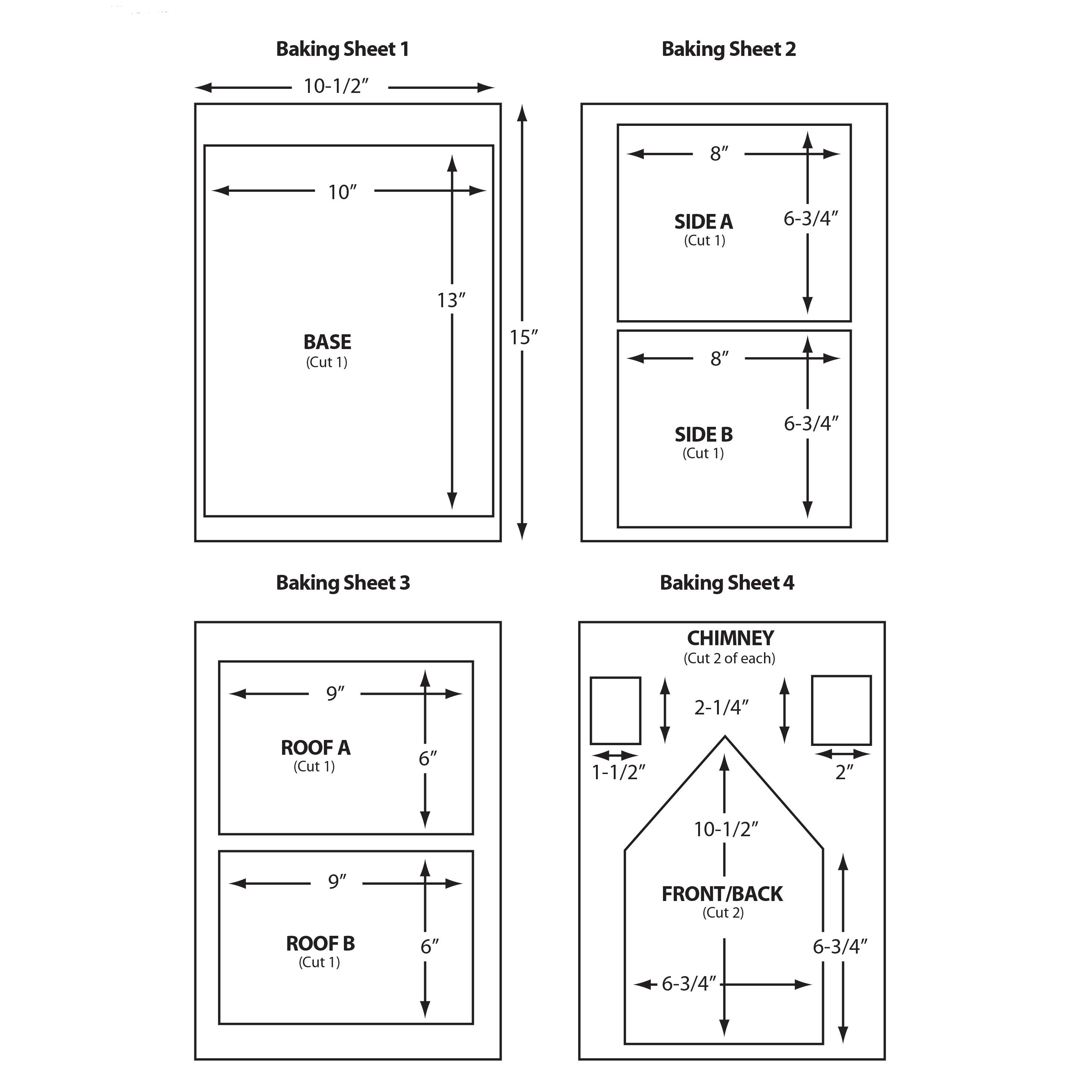 Here’s an easy-to-use template for your gingerbread house. Using this guide, pull out your ruler and some paper or cardboard to transfer the measurements. Trim each template piece with scissors or a utility knife and set aside.