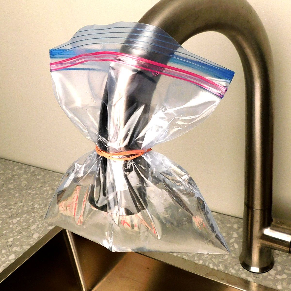 - Hold the bag in place by snapping a rubber band around it, affixing it to the showerhead or faucet.
