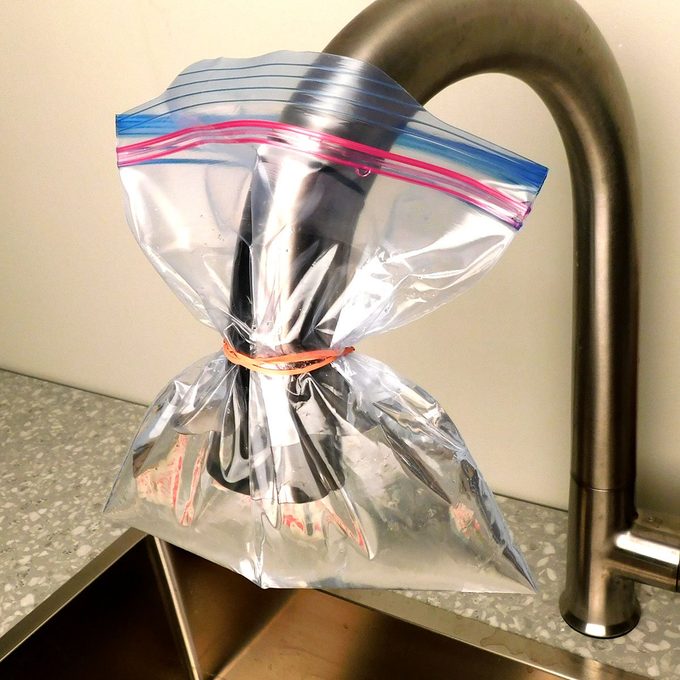 - Put a small plastic bag around the lemon and secure it around the faucet with a rubber band. Be sure the rubber band is cinched tightly and the lemon covers the end of the faucet.
