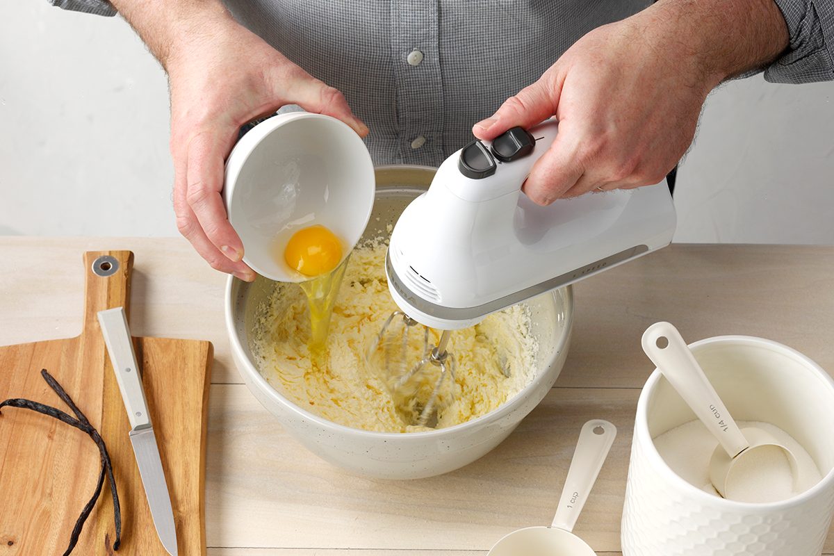 Start this recipe by creaming together the softened butter and sugar until nice and fluffy—about five minutes. Then beat in the eggs one at a time, fully incorporating after each addition.