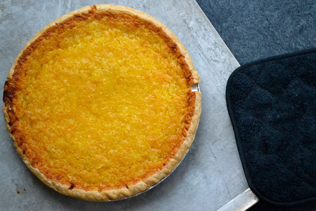 I then put the pie in the preheated oven at 350° and set the timer for 50 minutes. A bit concerned about the sugary goodness bubbling everywhere, I put an older sheet pan on the rack below and waited in anticipation as my home increasingly filled with the scent of sweet, tropical warmth. (And luckily, there was no bubble-over or mess to clean up.)