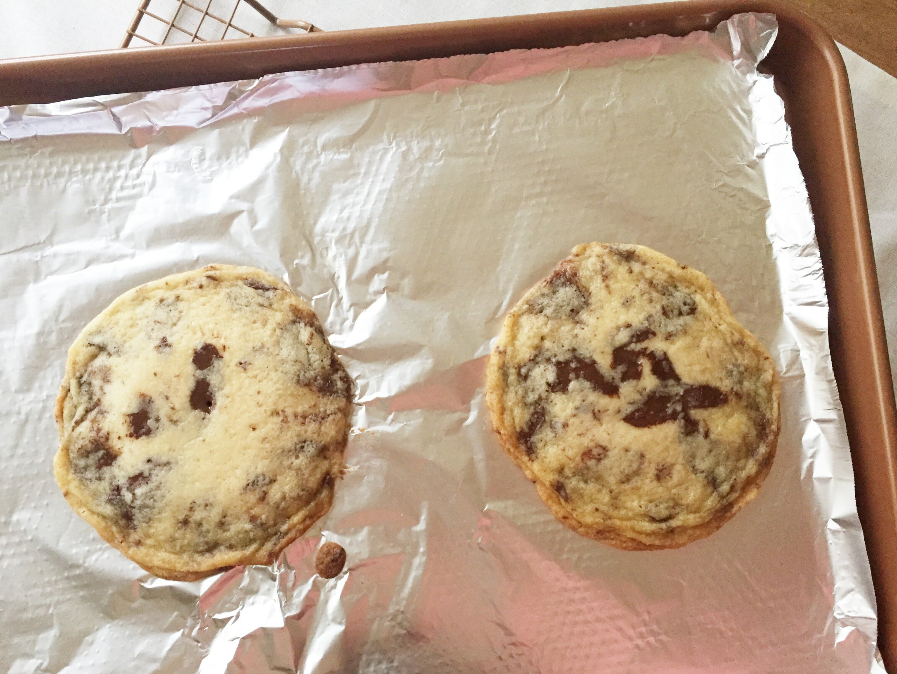 Now, the standard protocol for these cookies is over! Rather than lining a baking tray with parchment, the recipe recommends lining your cookie sheet with aluminum foil—dull side up—for crispier cookies. That was easy enough for me. The recipe goes on: Instead of dropping dough by the tablespoon onto the sheet, it recommends a whopping 1/3 cup of dough per cookie. I love cookies, so the bigger the better. Knowing that these would spread after wiggling, jiggling and banging the pan, I played it safe and only scooped two per sheet. Spoiler alert: This was the right idea.