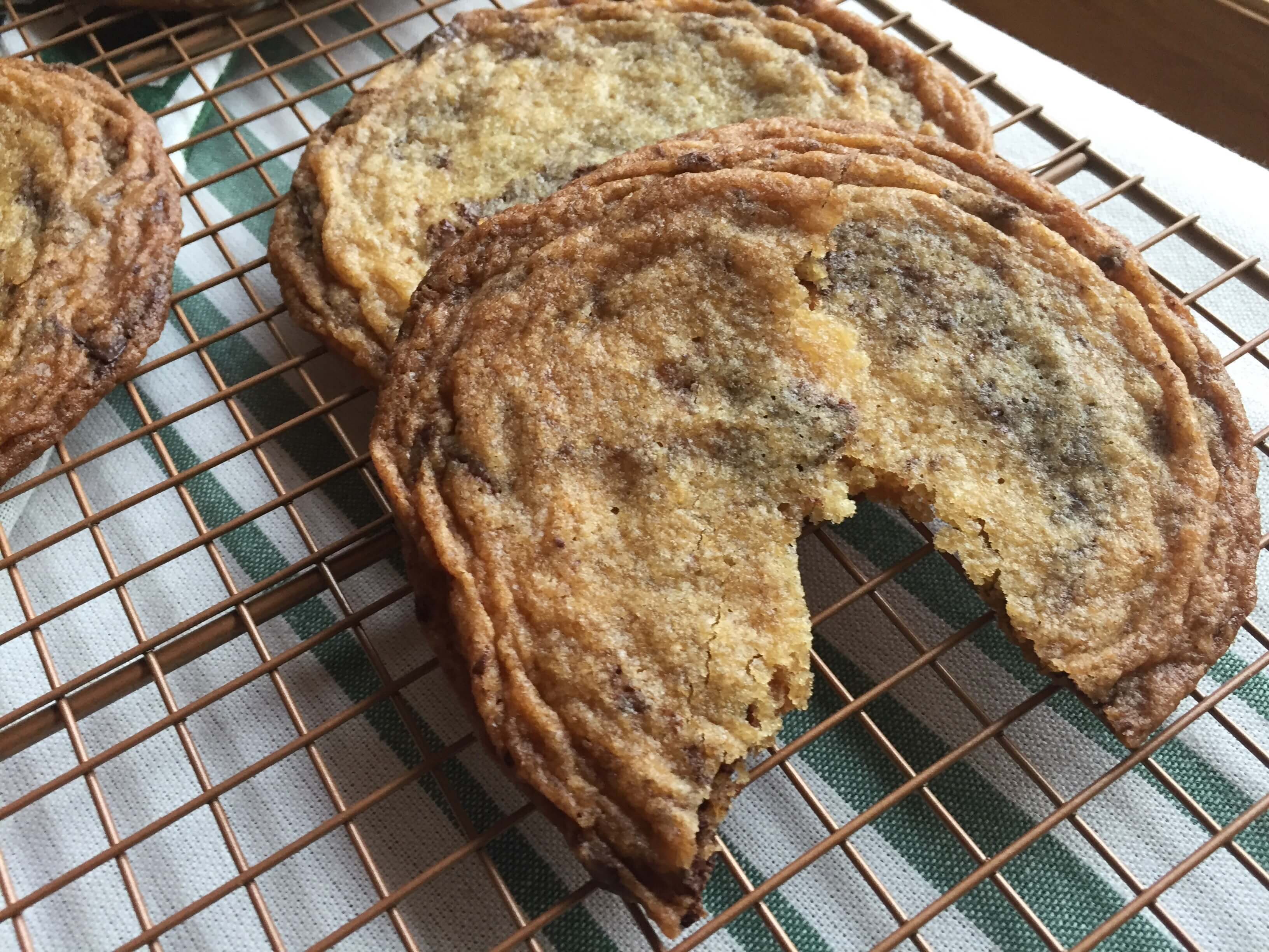 Pulling these out of the oven, I was pretty impressed with how they looked. First and foremost, these cookies were giant—at least the size of a saucer. When it comes to cookies, I’m a firm believer that bigger is better. What I noticed next was how beautiful that ripply pattern looked and how tempting those bits of chopped chocolate were peeking through the dough. It turns out that taking that extra step to chop chocolate, rather than using chips, helped give the cookies their beautiful texture (chips would have interfered with the crinkling).
