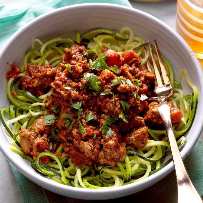 The first time I substituted zucchini noodles for regular pasta, it was because I was trying to reduce carbohydrates and calories. Now I make them because we love the flavor and texture they bring to dishes. This dish is just as delicious if you substitute shrimp for the chicken. —Suzanne Banfield, Basking Ridge, New Jersey