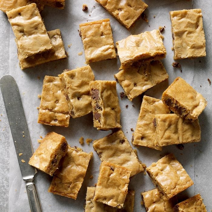 Folks who love the flavor of the classic cookie will enjoy that same great flavor in these chocolate chip bars. This blondie recipe can be mixed up in a jiffy, tastes wonderful, and is perfect for occasions when company drops by unexpectedly or you need a treat in a hurry. —Rhonda Knight, Hecker, Illinois