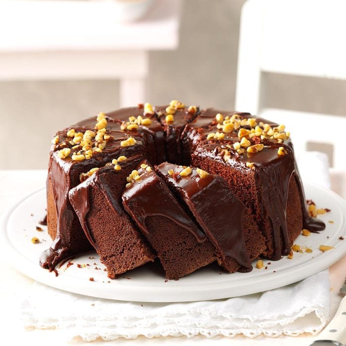 If you want to offer family and friends a dessert that really stands out from the rest, this is the cake to make. Beautiful high layers of rich sponge cake are drizzled with a succulent chocolate glaze. —Erma Fox, Memphis, Missouri