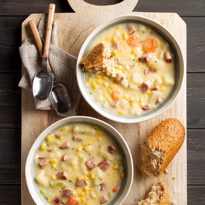 This tastes so good, as if it simmered for hours, but it’s ready in 15 minutes. I thought the original recipe was lacking in flavor, so I jazzed it up with extra corn and bacon bits. —Darlene Brenden, Salem, Oregon