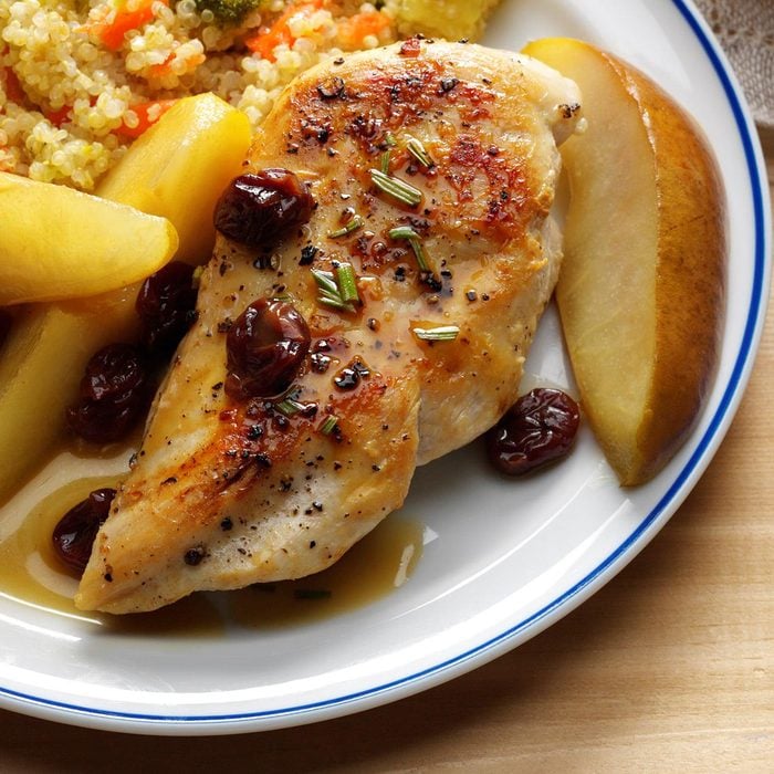 Pears and dried cherries go amazingly well with chicken and balsamic vinegar. It’s easy enough to make for a weeknight meal, but you can also dress it up for company. —Marcia Whitney, Gainesville, Florida