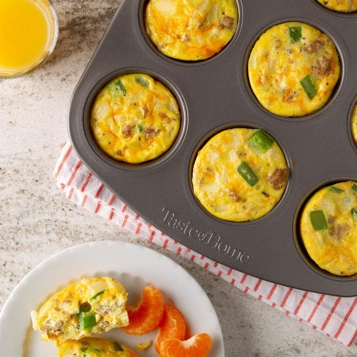 After enjoying scrambled egg muffins at a local restaurant, I came up with this breakfast egg muffins recipe that my husband likes even better. They’re pretty, hearty and fun to serve, too. —Cathy Larkins, Marshfield, Missouri