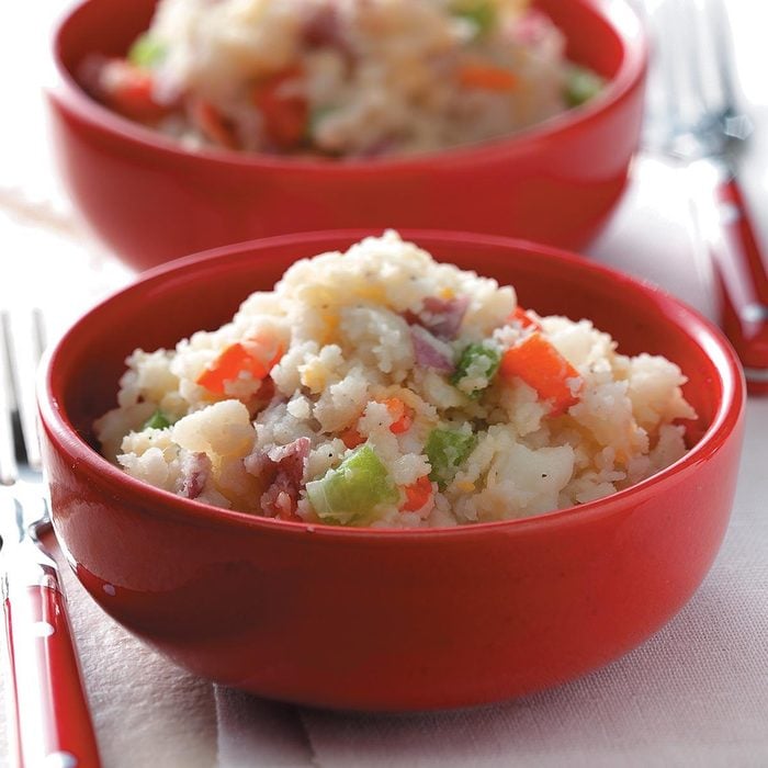 These mashed potatoes make a beautiful side dish for any meal. Onion, peppers and cheese add color and flavor to the potatoes. —LaDonna Reed, Ponca City, Oklahoma