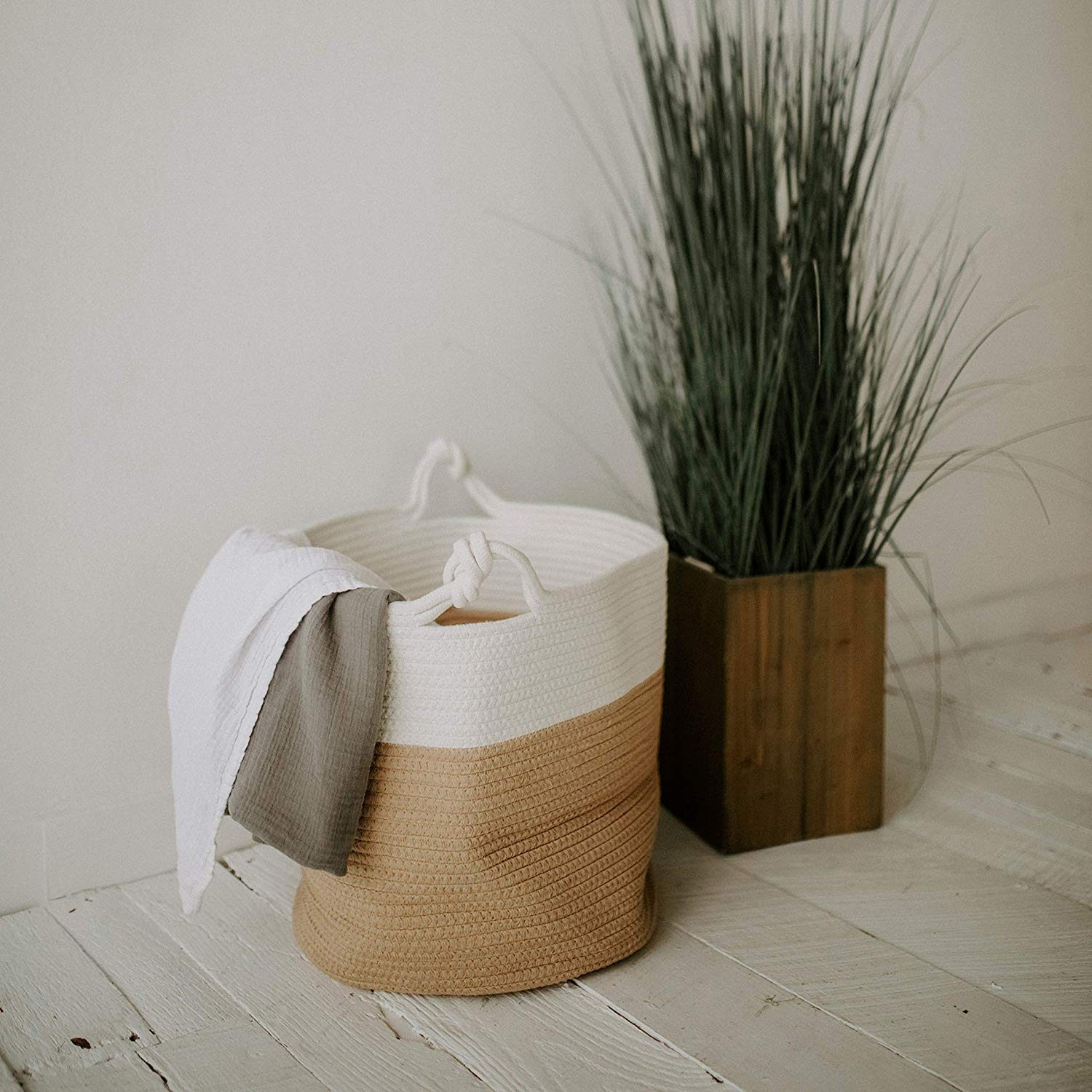 If your bathroom is big enough that a corner of it could use a little decor on the floor to add warmth, consider purchasing a decorative basket. A simple design made of natural material will provide that spa-like feel. This high-quality basket is made of handmade 100-percent cotton, and features a rope construction and stitched-in handles.