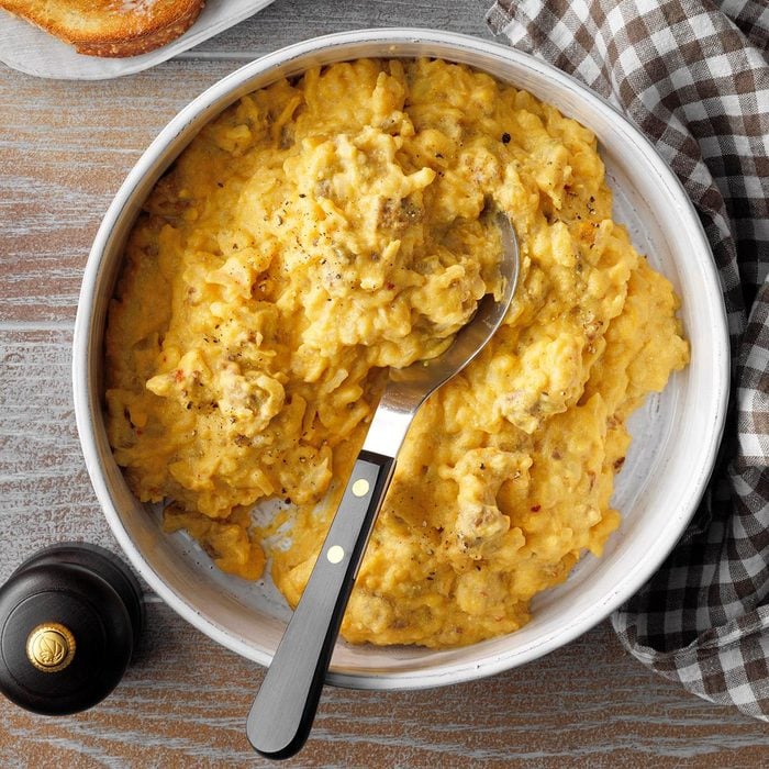 Scrambled eggs are a great way to start the day because they’re tasty and protein-packed. This four-ingredient recipe makes fluffy and rich eggs you can easily dress up with your favorite fixings. —Lisa Kaminski, Wauwatosa, Wisconsin