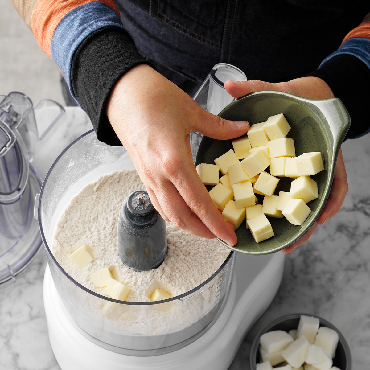 Another way to keep your hands off the butter in your biscuit dough is to not touch it at all! Catherine recommends popping the dry ingredients into a food processor with cold, cubed butter. Pulse a few times, then transfer into a mixing bowl to add the wet ingredients.