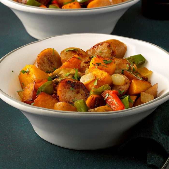 This hearty dish combines chicken sausage, peppers, pumpkin, mushrooms and onions. There’s so much protein in this meal that you won’t miss the eggs for a second.