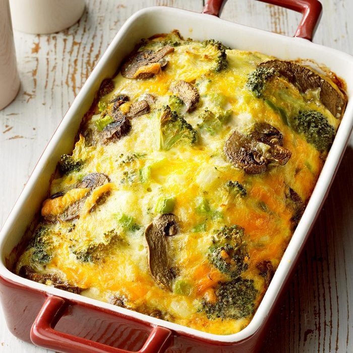 This cheesy, flavorful egg bake is packed with veggies. My husband and I enjoy it just as much for late-night suppers as we do for brunch. Swap in an egg substitute if you’re cutting the fatin your diet. A simple side of fresh fruit makes a perfect refreshing complement for this dish.—Pauline Howard, Lago Vista, Texas