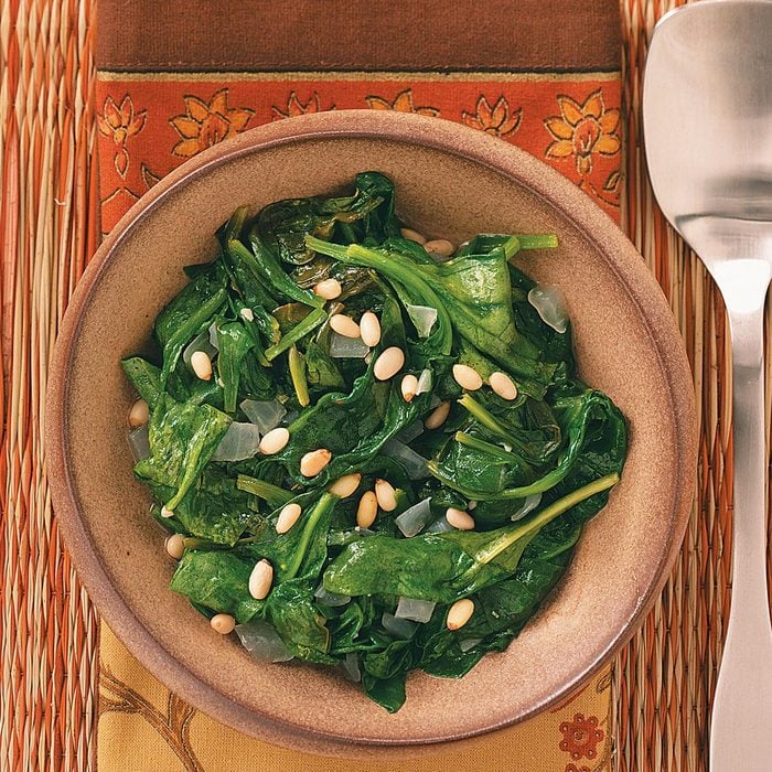 Here’s a light, lively side to complement almost any entree you put on the table. A little test kitchen know-how helps to dress up everyday spinach with garlic, onion, a lick of sherry and a sprinkling of pine nuts. —Taste of Home Test Kitchen