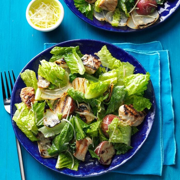 My Caesar with grilled chicken is a healthier alternative to heavy meat and potatoes dishes. After grilling the kabobs, we serve them family style. —Melissa Adams, Tooele, Utah