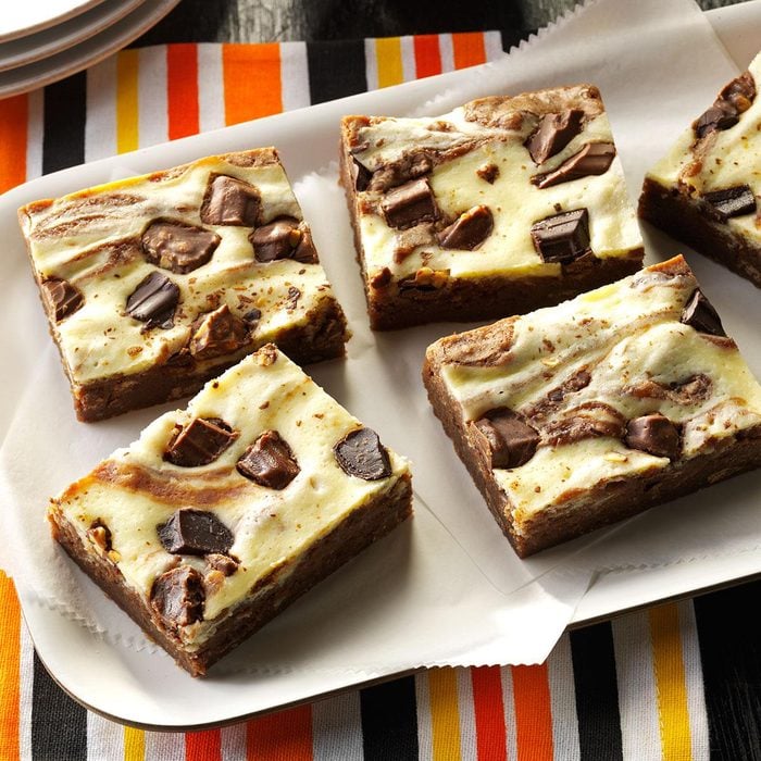 I came up with these brownies as a way to use up my son's leftover Halloween candy. You can tint the cream cheese orange for a spooky touch. —Elisabeth Larsen, Pleasant Grv, Utah