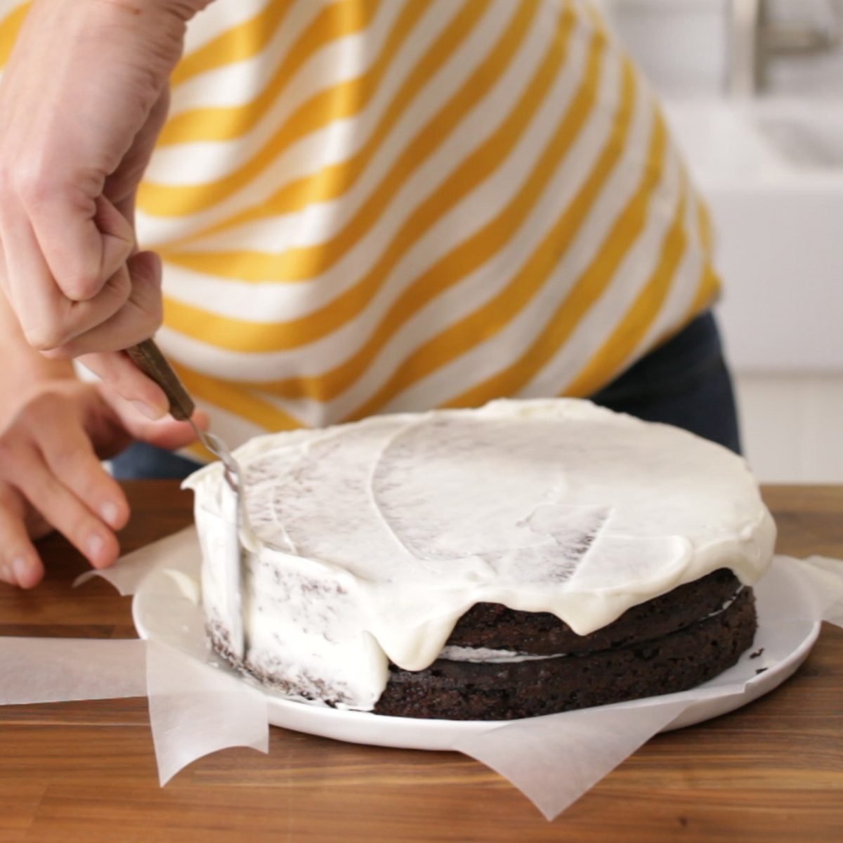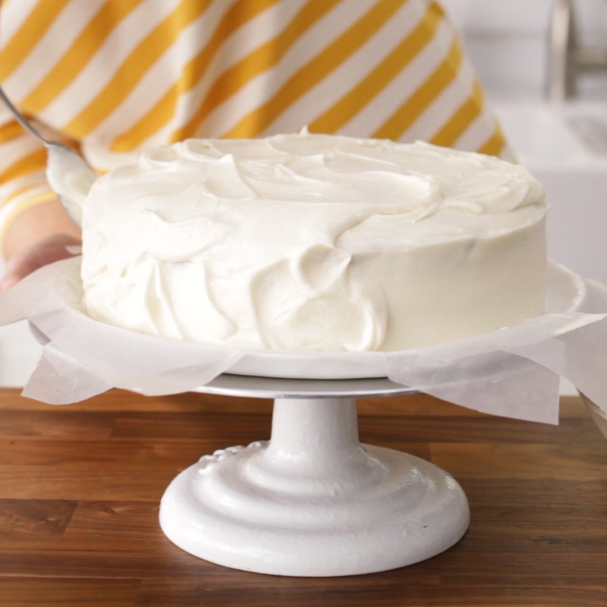 We get it: You definitely don’t want to transfer your cake from one tray to another before serving. To prevent your serving plate or cake stand from looking messy after frosting, first line the edges with strips of waxed paper. When you’re done frosting, remove the strips and reveal a clean plate that’s ready to show off.