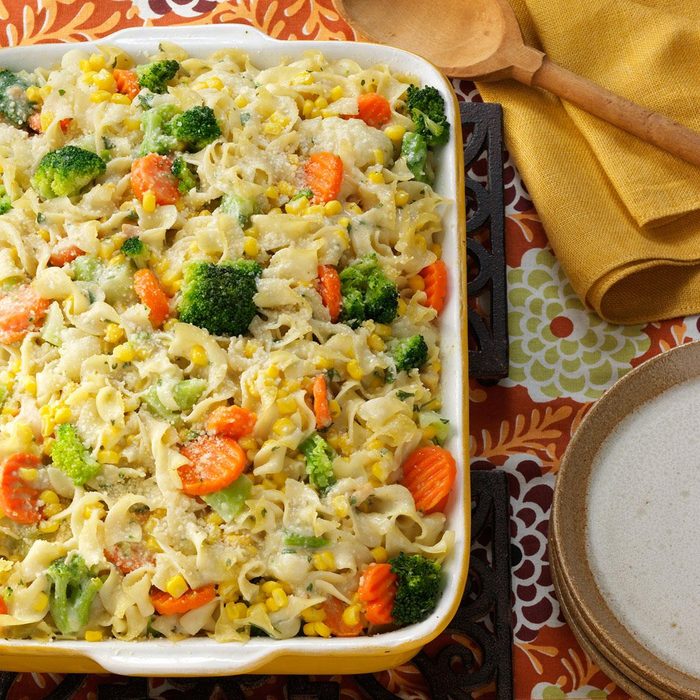 If you're looking for a filling side dish, this recipe fits the bill. It combines nutritious vegetables and hearty noodles in a delectable cream sauce. Whenever I serve this dish, it gets passed around until the pan is scraped clean. —Jeanette Hios, Brooklyn, New York