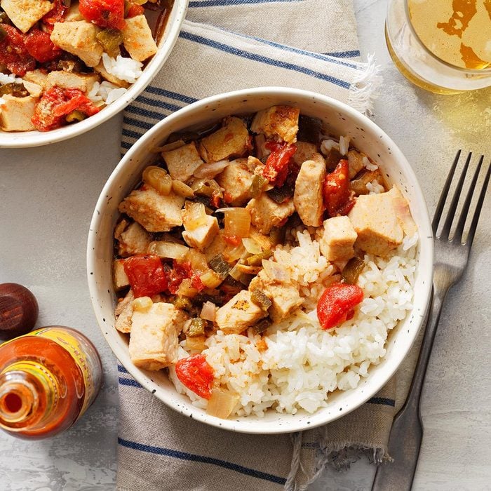 1-1/2 cups: 366 calories, 11g fat (3g saturated fat), 71mg cholesterol, 605mg sodium, 40g carbohydrate (9g sugars, 6g fiber), 28g protein. Diabetic Exchanges: 3 lean meat, 2-1/2 starch, 1/2 fat.