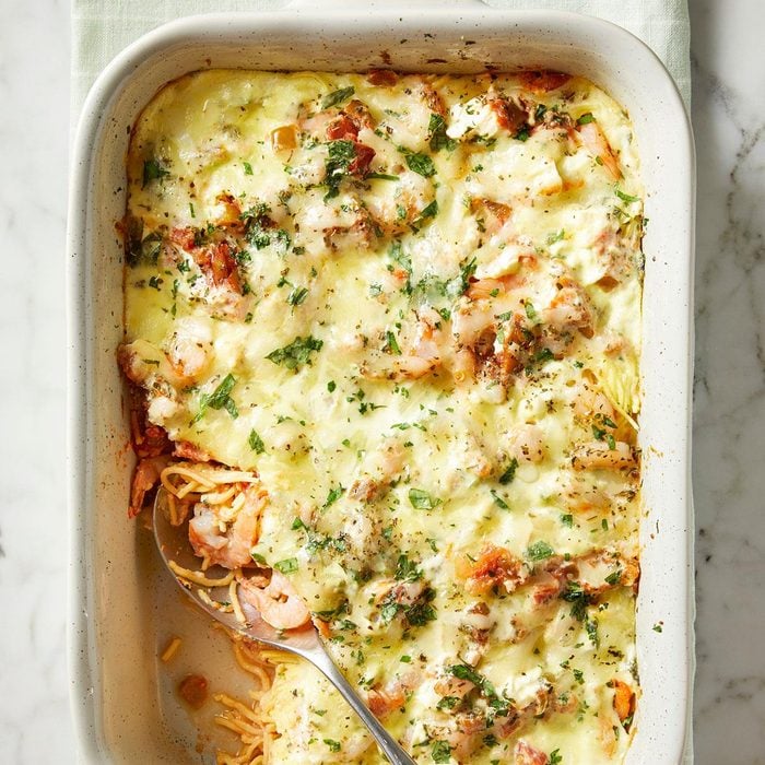 Shrimp pairs beautifully with the herbs, salsa and three kinds of cheese in this baked angel hair pasta casserole. The shrimp make this dish special enough for a guests, but your family is sure to enjoy it, too. —Susan Davidson, Elm Grove, Wisconsin