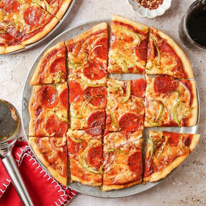 This tasty pizza is the perfect combo—quick and easy to make, and a winner with even picky eaters. It’s a handy option for a family dinner on a busy night or for a casual dinner party. —Karen Wittmeier, Parkland, Florida