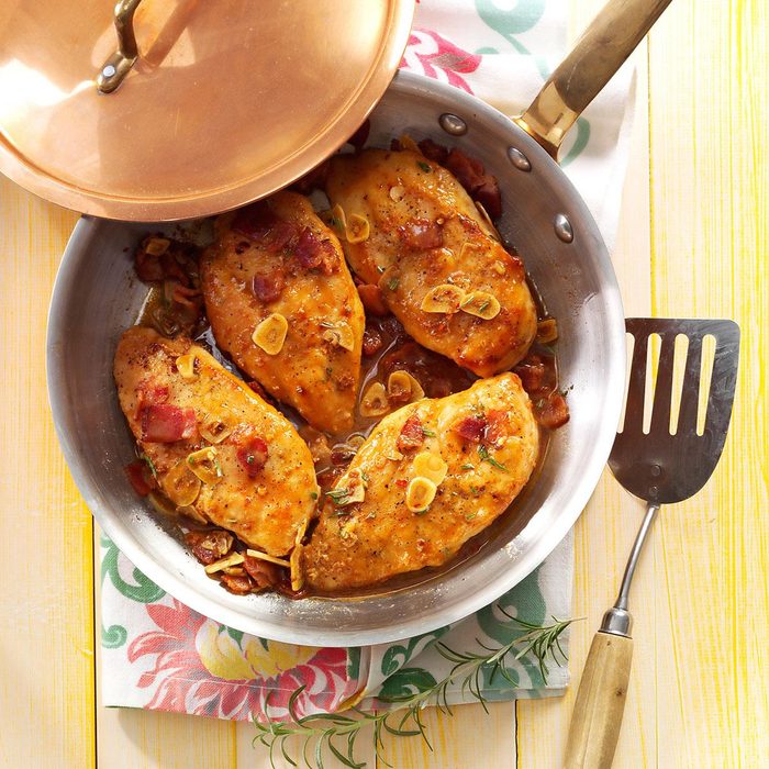 After trying a similar chicken dish in a restaurant, I decided to re-create it at home. Topped with bacon, caramelized onions and shredded cheese, this savory dish comes together in no time, and uses ingredients that I usually have on hand. And since it cooks in one skillet, it’s a cinch to clean up! —Brenda Carpenter, Warrensburg, Missouri