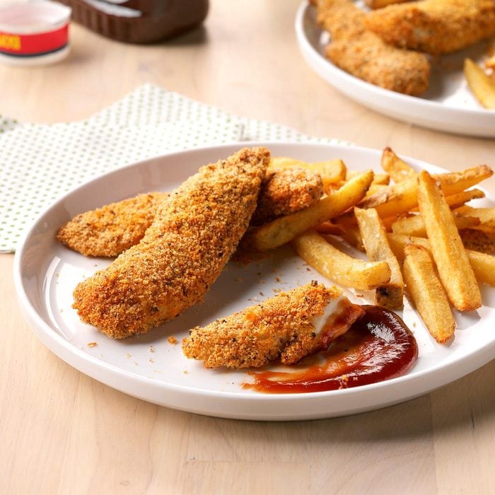 These savory strips are designed for kids, but tasty enough for company. The tender strips are moist and juicy and would be great on top of a Caesar or kale salad.