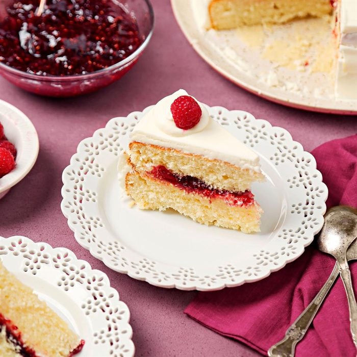 This is the cake you bake when you're looking to impress. With an almond-flavored cake, raspberry jam filling, white chocolate frosting and raspberries as a garnish, it's truly remarkable. —Julie Andrews, Rockford, Michigan
