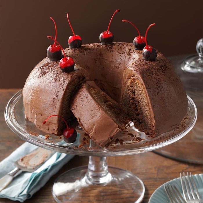 Cherry pie filling and a melted chocolate drizzle top a rich, fudgy cake made from chocolate cookie crumbs. —Taste of Home Test Kitchen