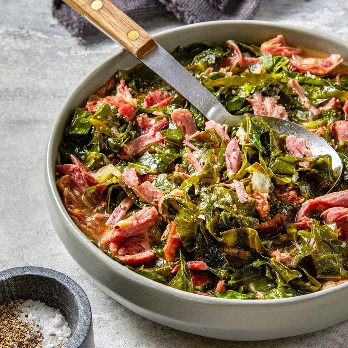 Collard greens are a staple vegetable of southern cuisine. This side dish is often made with smoked or salt-cured meats, such as ham hocks, pork or fatback. —Marsha Ankeney, Niceville, Florida