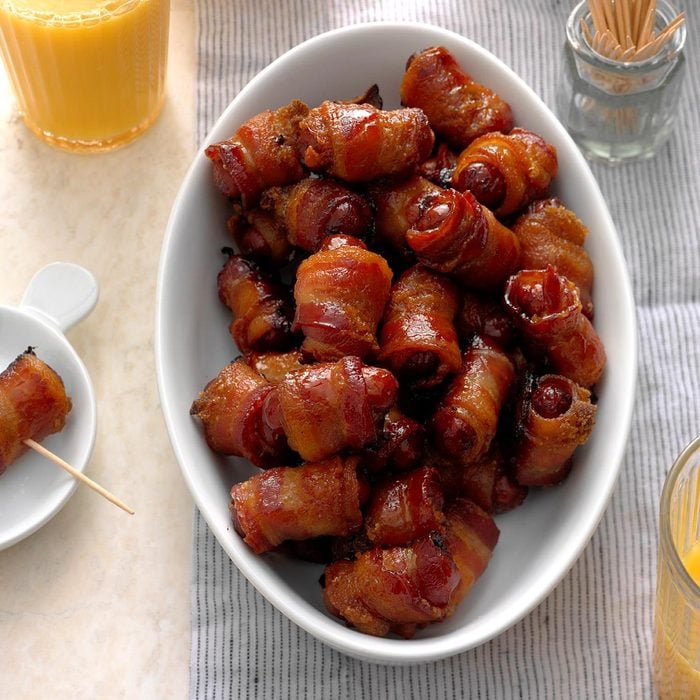 These cute little cocktail weenie and bacon bites are finger-licking good. They have a sweet and salty taste that’s fun for breakfast or as an appetizer. —Cara Flora, Kokomo, Indiana