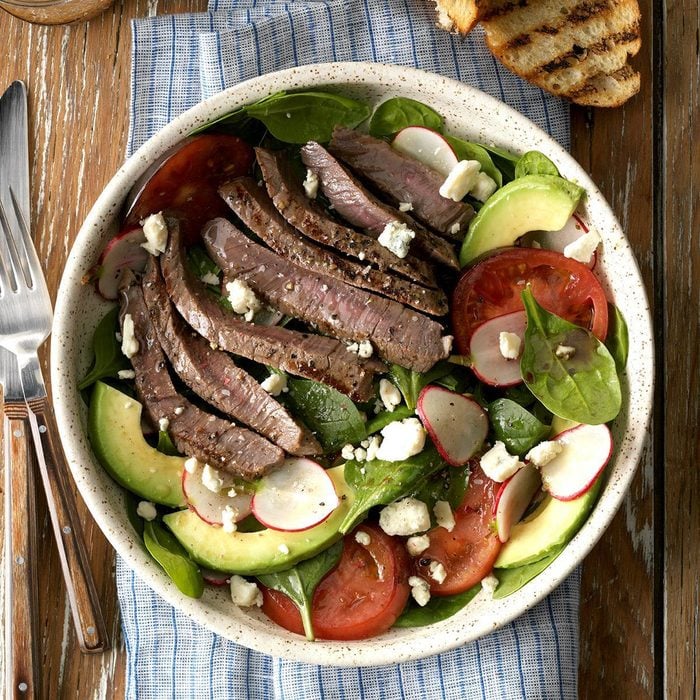 My husband loves this salad, especially during summer. He says he feels as if he’s eating a healthy salad and getting his steak, too! I always serve it with some fresh homemade bread. —Julie Cashion, Sanford, Florida