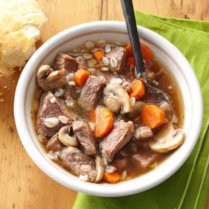My entire family just loves this delicious and comforting soup. Loaded with chunks of tender beef, the rich broth also includes plenty of fresh mushrooms, sliced carrots and quick-cooking barley. —Barbara Beattie, Glen Allen, Virginia