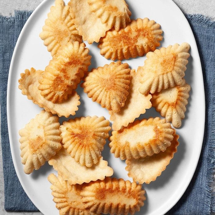 Translated from Norwegian, the name of these cookies is "'sand tarts." They're most attractive if baked in authentic sandbakkelse molds, which can be purchased online or in a Scandinavian import shop. Most any decorative cookie mold will do, though, and the interesting shapes will make these tarts the focus of your cookie tray. —Karen Hoylo, Duluth, Minnesota