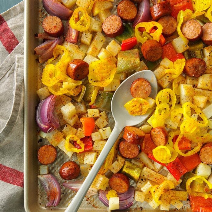 I love to share my cooking, and this hearty sheet-pan dinner has built a reputation for being tasty. People have actually approached me in public to ask for the chicken sausage recipe. —Laurie Sledge, Brandon, Mississippi