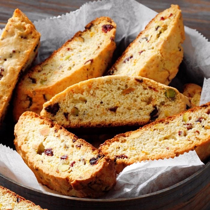 This tasty biscotti is studded with dried cranberries and crunchy pistachios. It's delicious with tea or coffee. —Diane Gruber, Sioux City, Iowa