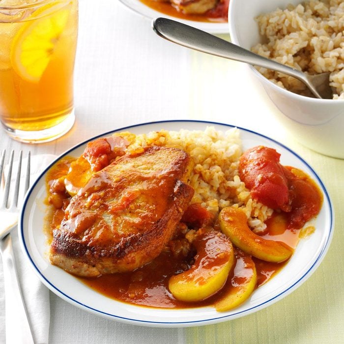 1 pork chop with 3/4 cup tomato mixture and 2/3 cup rice (calculated without almonds): 478 calories, 14g fat (5g saturated fat), 89mg cholesterol, 475mg sodium, 50g carbohydrate (15g sugars, 7g fiber), 38g protein. Diabetic Exchanges: 5 lean meat, 2 starch, 2 vegetable, 1/2 fruit, 1/2 fat.