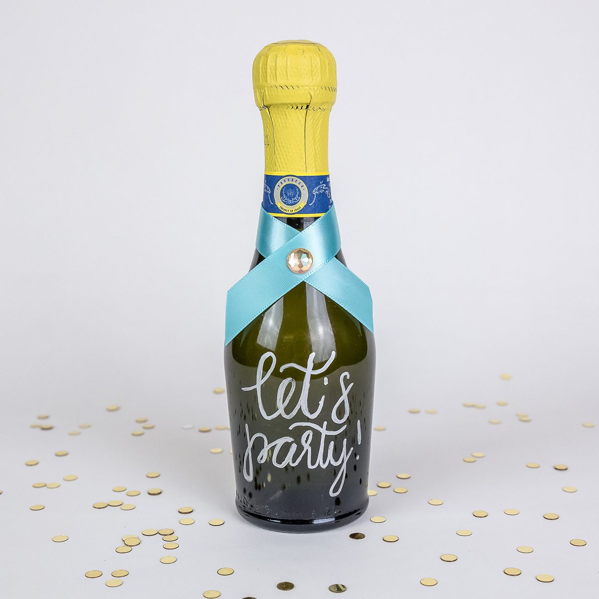 Personalize a bottle of sparkling wine of any size with a cute and festive message (it’s a great excuse to brush up on your hand lettering skills!). Start this project by removing the label from your bottle. The easiest way to get rid of every last bit of adhesive is to soak the bottle—label and all—in warm water and a few tablespoons of baking soda (your kitchen’s secret cleaning ingredient). After 15 minutes, the label will peel right off.