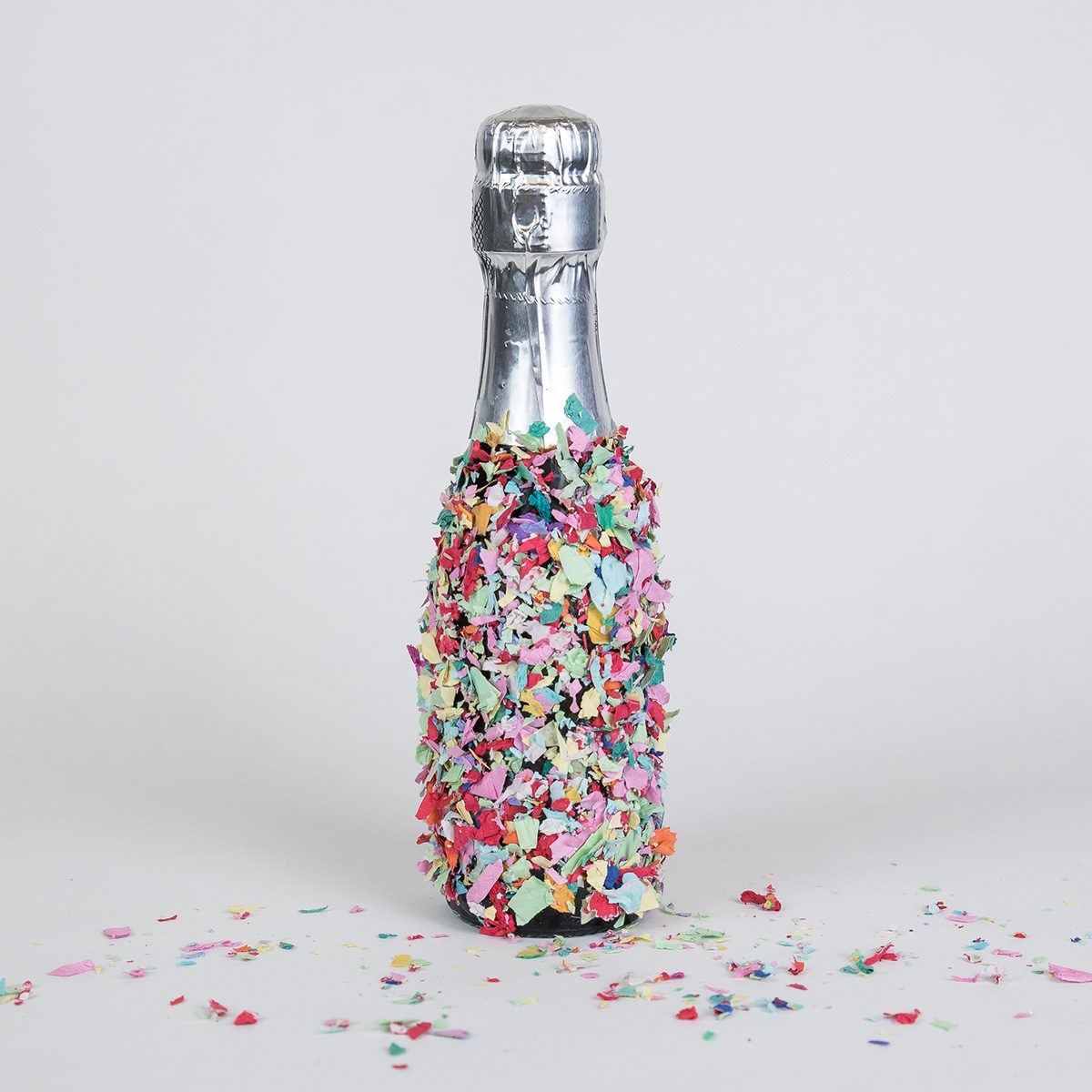 Sparkling wine is just the thing for celebrations, just like a handful of confetti. Decorate a mini champagne bottle with ample confetti. To make this one, brush the bottle with Mod Podge or just some white glue diluted with a bit of water. Then roll the bottle in the confetti of your choosing (we like this tissue paper variety). Let this dry and it’s ready to gift!