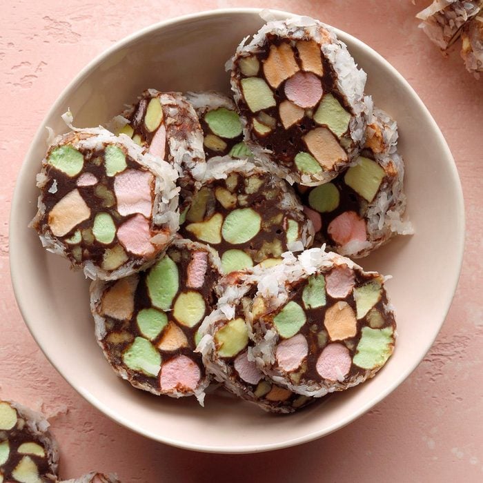 Children love the colorful marshmallows in these festive confections, which look like stained glass when they’re sliced. They practically light up the room from the serving platter at our holiday parties. —Carol Shaffer, Cape Girardeau, Missouri
