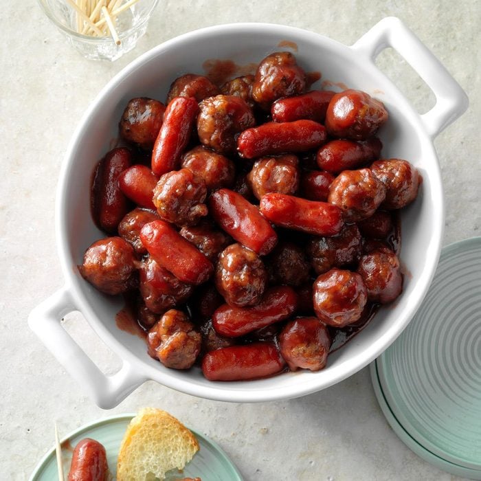 From the Recipe Creator: Years ago, I found a version of this sausage and meatballs recipe in a cookbook. At first taste, my family judged it a keeper. The tangy, saucy meatballs are requested by our friends whenever I host card night. We also take the yummy dish on camping trips. —Marybell Lintott, Vernon, British Columbia