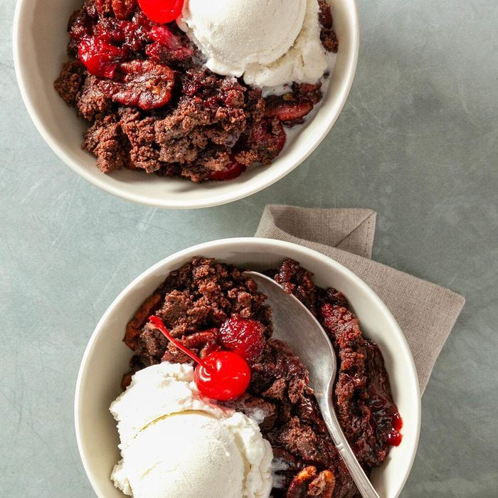 I make a black forest cake the easy way: Dump everything into a dish and let the magic happen. Give it a cherry topping by reserving two tablespoons of juice from the canned cherries and stir into whipped cream. —Meghan McDermott, Springfield, Missouri