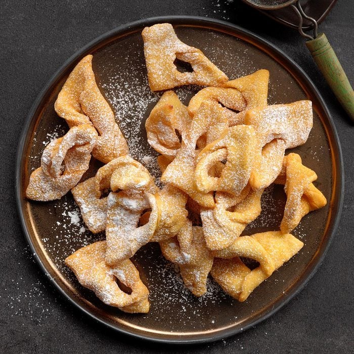 This crispy, dainty pastry dusted with confectioners’ sugar has an eggy flavor similar to cream puffs. I honor my Ukrainian heritage by serving khrustyky on Christmas Eve as part of the traditional feast of 12 dishes. Each dish symbolizes one of the apostles. —Carol Funk, Richard, Saskatchewan