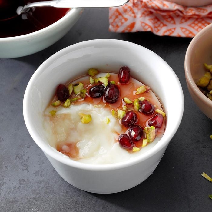 Rose water rice pudding is a popular Middle Eastern treat. Pomegranate seeds and chopped pistachios add a simple yet elegant touch to this floral Lebanese specialty. —Michael & Mathil Chebat, Layla’s Lebanese Restaurant, Lake Ridge, Virginia