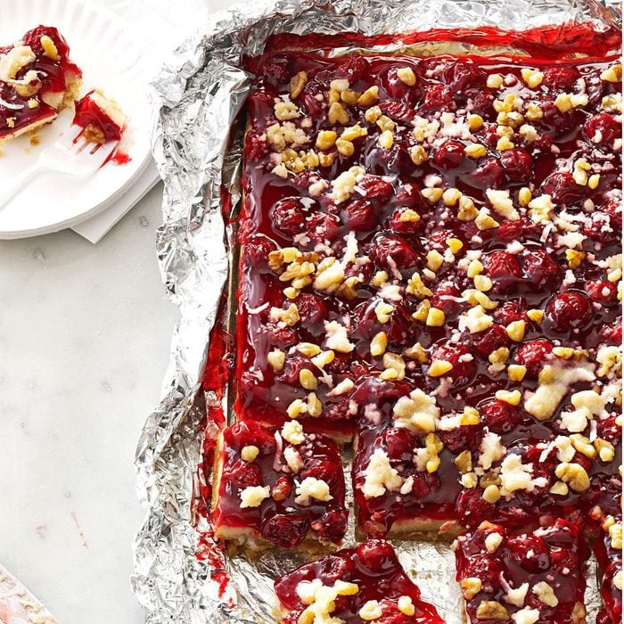 Whip up a pan of these festive bars in just 20 minutes with staple ingredients and cherry pie filling. Between the easy preparation and the pretty colors, they're destined to become a holiday classic. —Jane Kamp, Grand Rapids, Michigan